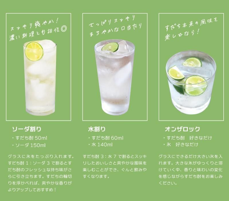 たとえば、すだち酎3(90ml):炭酸水4(120ml)で割ると、すだち酎1本ですだちハイボールを8杯も楽しめます!